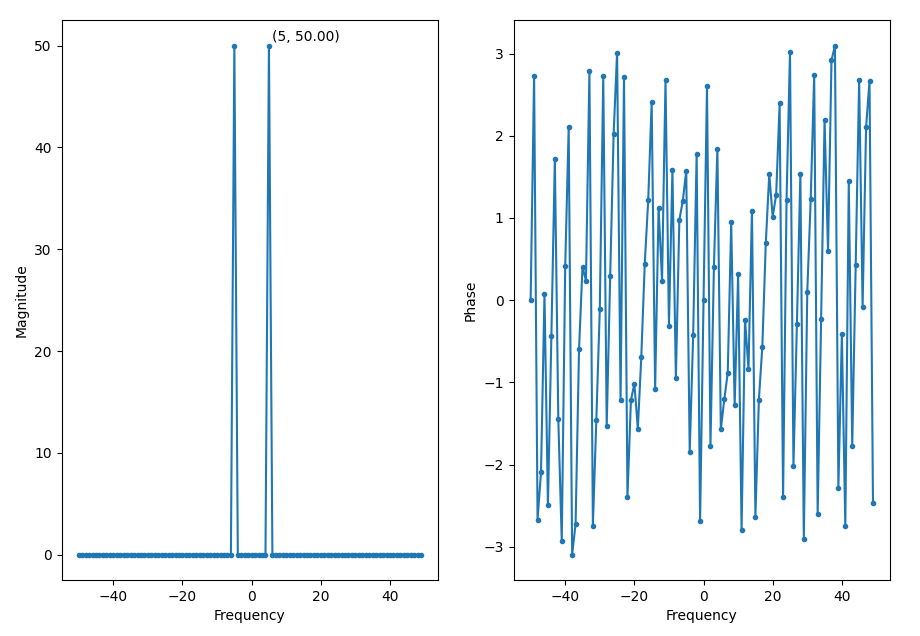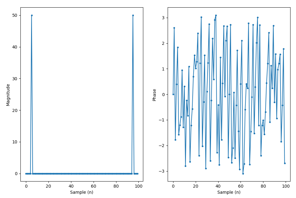 The output will be an array of complex numbers. We can calculate the magnitude and phase of the complex numbers and plot them out.